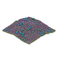 In order for excitable cells to function correctly certain proteins (called ion channels) are critical to allow charged ions to pass across the membrane. The image shows a certain type of ion channel (a voltage-gated sodium channel, blue) that has recently been shown to cluster with other proteins called beta 3 subunits (shown in green). Although it has been shown previously that these proteins interact we have yet to have a clear picture of just what this interaction is and how it can affect the density, location and function of the ion channel. In order to investigate this computationally we used large scale coarse-grained simulations (where 4 'heavy' atoms are represented by 1 'bead'). We constructed a membrane using lipids that are typically found in mammalian cells, with 9 copies of the ion channel and 36 copies of the smaller beta 3 subunit. This system was run for 20 microseconds.