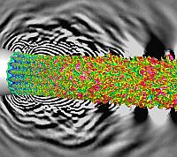 This image shows the broadband noise generated by a turbulent jet from serrated nozzle. The nozzle serration is used to break up turbulent structures into small scales for noise reduction. The q-criterion shows the turbulent structures and background grey-scale contours shows emitted acoustic waves. Multi-scale phenomena can be seen from perspectives of both turbulence and acoustics. Acoustic waves are generated at different locations in the near field and interfere as propagating to the far field.
